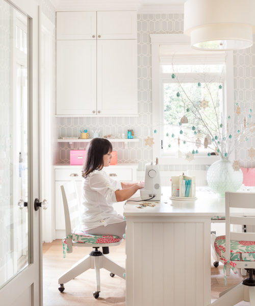 LEFT: The craft room takes the place of a home office and provides a spot for the family to indulge their love of DIYs. Schumacher WALLPAPER, AnneStarr; DESK, DESK CHAIRS, Pottery Barn; SEAT CUSHION FABRIC, Caitlin Wilson Textiles.