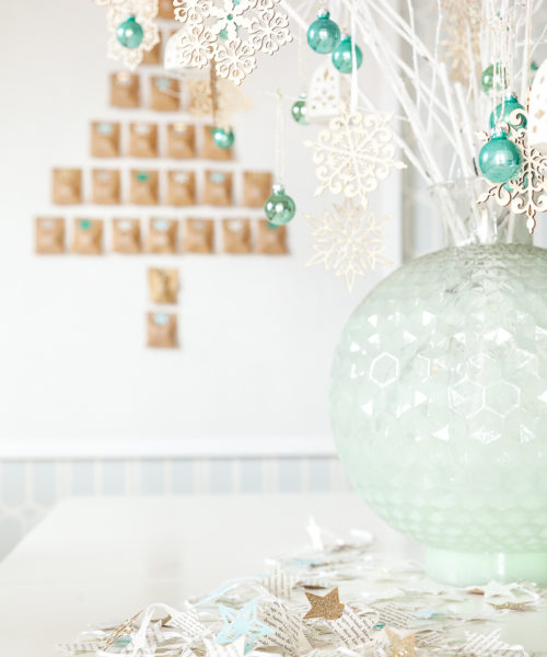 LEFT: A mint green vase holding white-painted branches decorated with glass balls and wooden snowflakes serves as a festive centrepiece in the craft room. The handmade paperstar garland is destined for the living room.DESIGN, Kelly Deck Design, kellydeck.com; ARCHITECTURE, Sunshine Coast Home Design; CONTRACTING, A.T. Home Construction; GREENERY & PLANTS (throughout), Art Knapp, The Flower Factory; mini ball and snowflake ORNAMENTS, Roost.