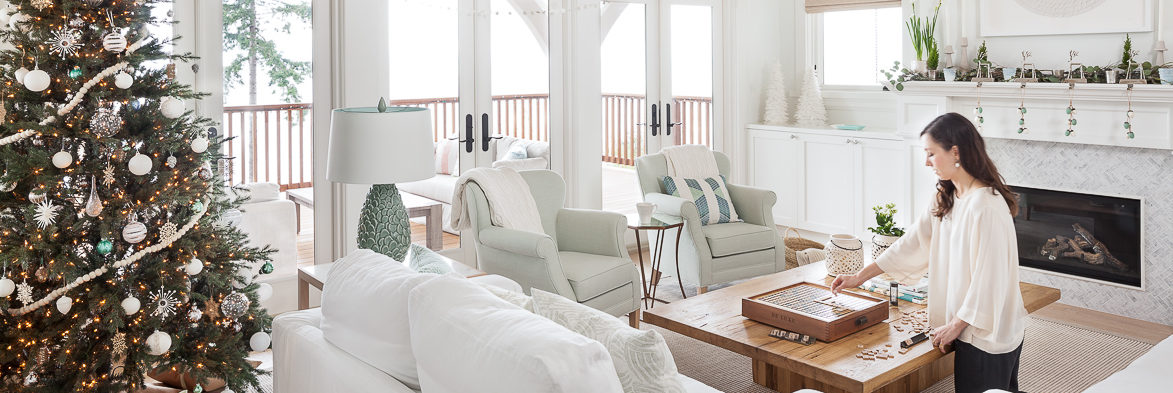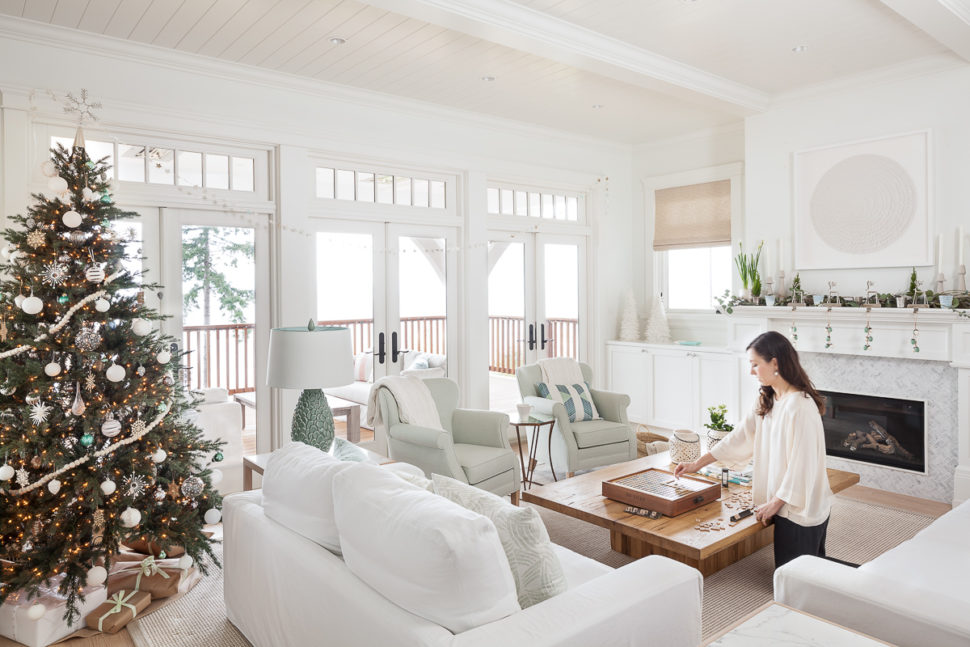 But in this case, the homeowners, Canadian expats who live in Bermuda, admittedly knew what was coming. They enlisted Nicole Mah and Kelly Deck of Vancouver’s Kelly Deck Design to decorate the house for the holidays, but gave the designers carte blanche so the decor would be a complete surprise when they arrived after a long flight. “The homeowners said, ‘Surprise us,’” says Nicole, who was also the interior designer on the project when the 4,500-square-foot cottage was being built. “I’ve gotten to know the owners’ tastes over the past three years, so it was really effortless for me to create a Christmas look that was true to their aesthetic and consistent with the style of the space.”
