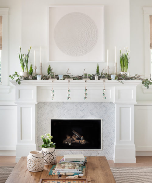 RIGHT: Designers Nicole Mah and Kelly Deck dressed the living room mantel with candles, tiny cypress trees and paperwhites (a classic holiday flower) set among loosely placed branches. Discus ARTWORK, Cissy Cook Designs; CANDLESTICKS, Crate and Barrel; mercury glass VOTIVE HOLDERS, West Elm; white glass VOTIVE HOLDERS, Indigo; reindeer STOCKING HOLDERS, Pottery Barn.