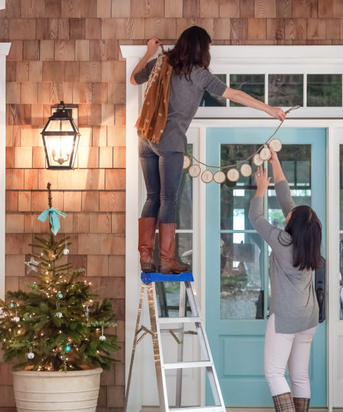 RIGHT: “We didn’t want anything to take away from the beautiful turquoise door,” says Nicole. So the designers strung a simple wood-disc garland that says “Merry Christmas” along the transom window. Blue Ground 210 FRONT DOOR PAINT, Farrow & Ball. RIGHT In the grand entryway, the banisters are decorated with faux evergreen garland embellished with pretty bows and delicate acorn and snowflake ornaments. CONSOLE, Stanley Furniture; GARLAND, IKEA; acorn and snowflake ORNAMENTS, Roost.