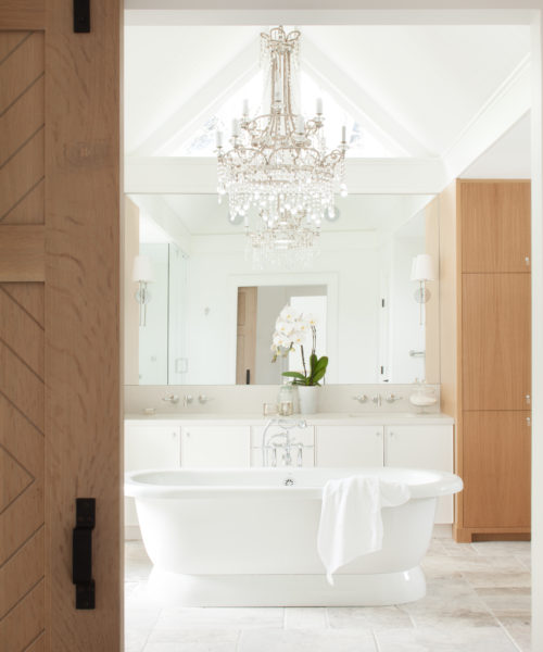 The dramatic architecture of this ensuite, including the peaked roof, called out for a light fixture with volume. “The chandelier really adds to the romance of the space,” says designer Kelly Deck.