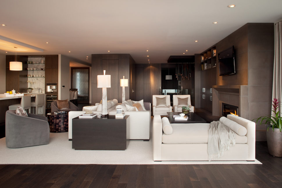 “This is where it all happens,” says Kelly of the great room, which has panoramic views of the ocean. Several seating areas offer places to read and relax, entertain, have dinner while watching a movie, or just gaze outside. The fireplace’s concrete surround and mantel creates a striking feature wall that works well with the dark stained cabinetry. The ivory- and heather-grey upholstered pieces balance the room’s dark furnishings.