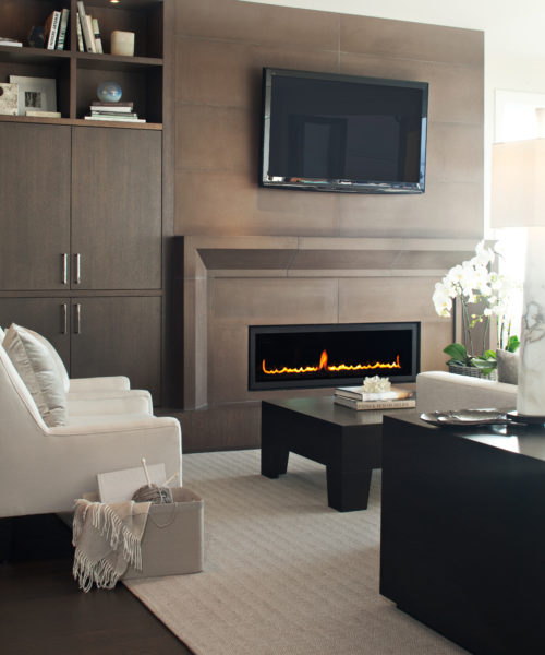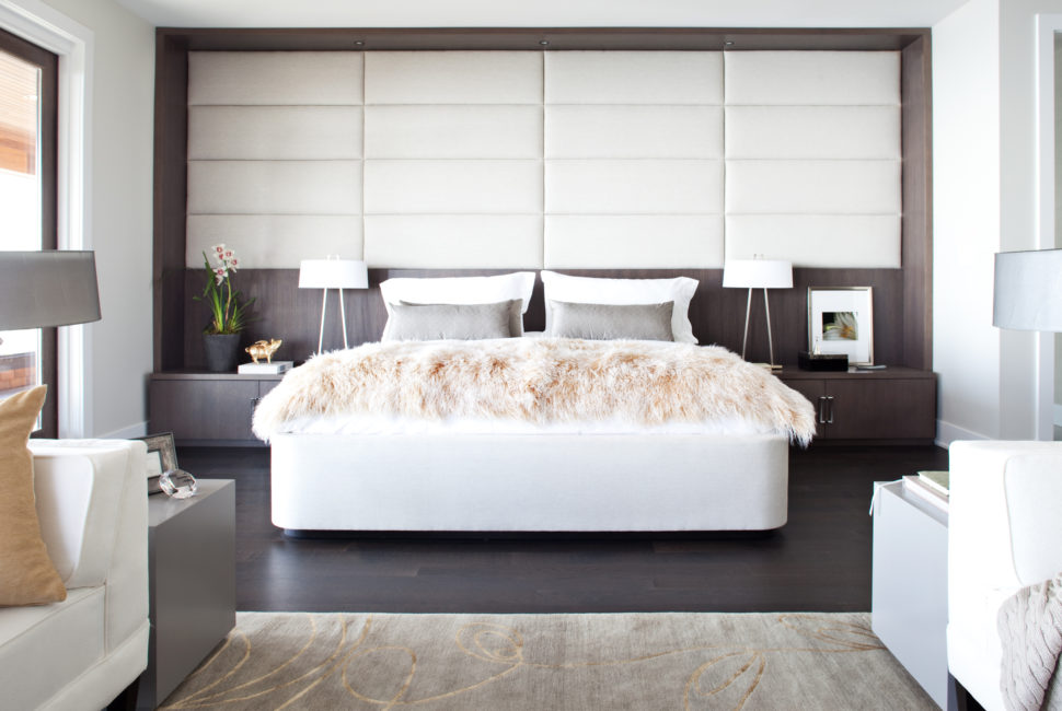 The seating area in the master suite provides a spot to relax and enjoy the house’s spectacular surroundings. Low furnishings in colours that suggest stones and seashells allow unobstructed views to the outside. A fireplace with a modern concrete surround serves as a focal point. Throughout the room, a variety of textural elements in natural tones were used: a wool rug, fur throws and a shimmery velvet ottoman. End tables in slate grey ground the space as black might do, but are more true to the Pacific Northwest’s hazy skies.