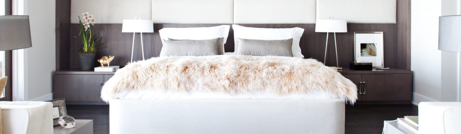 Kelly embraced the large scale of the master bedroom and incorporated an 18-foot-wide linen-upholstered headboard. Twin side tables, lamps and bolsters create a pleasing symmetry. A fluffy throw at the foot of the bed adds texture.