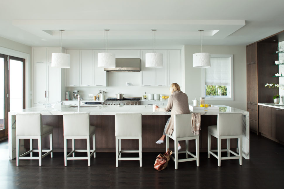“We didn’t even know if such a thing existed,” says Kelly, referring to the 15-foot-long marble slab she wanted for the kitchen island. Turns out it did. A breakfast bar surrounded by cabinetry was added at one end of the kitchen to provide extra workspace and ample storage. Kelly selected simple pendant lights with white drum shades for over the island to complement the decor in the adjoining living room.