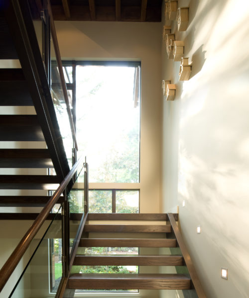 The glass stairwell offers an airy, modern look and allows for unobstructed sightlines. Large-scale art in a cool palette and a light fixture with pendants reminiscent of inverted bulrushes suggest the outdoors.